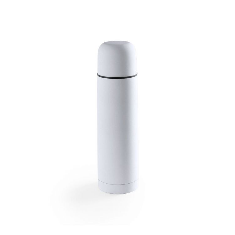 500ml stainless steel thermos flask in brightly colored monochrome design. With safety dispenser and screw-on cap convertible in cup. Presented in an individual box. Instruction manual available in Spanish and English.