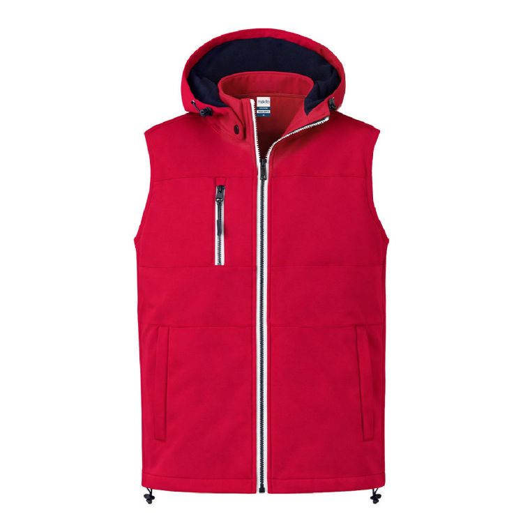 Vest made of durable and breathable 300g/m2 soft shell material. Modern fit with central zip, side pockets and practical chest pocket with zip fastenings and contrasting zip pullers. Stand-up collar with adjustable and detachable hood. Bottom hem with adjustable string. Wind and water resistant soft shell outside, and warm micro fleece lining in contrast colour. Available in sizes XS, S, M, L, XL, XXL.