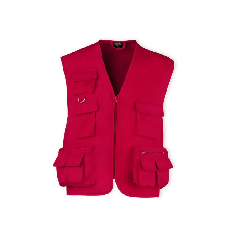Vest in resistant combination of cotton and polyester materials in bright tones. Main zipper closure, plenty of front and side pockets with large capacity and velcro closure and metal ring on the chest. Available in sizes L, XL, XXL.