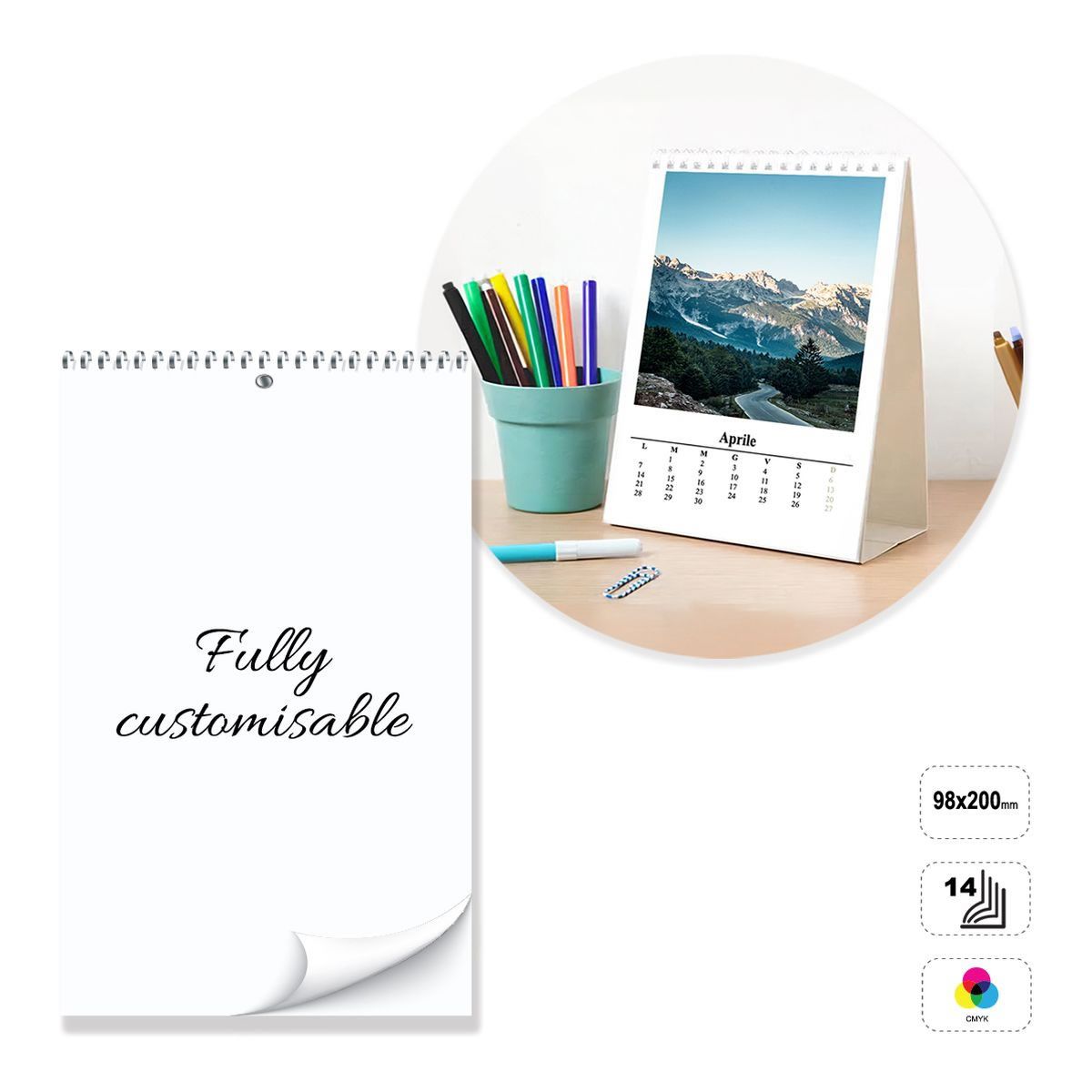 Vertical desk calendar, fully customisable. The product consists of 14 sheets of 135 gram matt coated paper, printable front or front and back in full colour. Bound with a silver, white or black metal spiral at the top. Non-printable 300 g white cardboard backing. The calendar can be customised by modifying the preset template, or constructed completely following the guidelines provided in a neutral template.