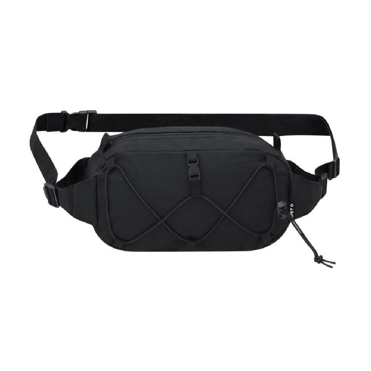 Fanny pack made of 600D RPET polyester. It has a main pocket with invisible zipper closure in black, with black metal puller, and adjustable strap with buckle closure on the strap. On the front it includes an adjustable elastic cord. Includes distinctive RPET label. (black color)