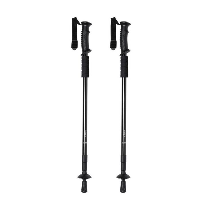 Set of folding poles with aluminum body, anti-shock mechanism and soft foam hand rests. Comfortable ergonomic, adjustable security belt and snow accessory. Reinforced ground contact surface. Presented in an individual bag with shoulder strap. Poles available in 3 colors.