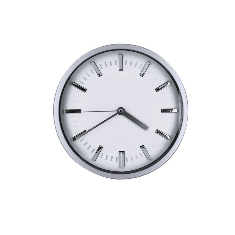 Wall clock made with aluminum and glass structure. The face is distinguished by chrome hour markers and quarter markings in silver tone, offering a sophisticated and functional style. Requires battery (1xAA not included). (silver color)