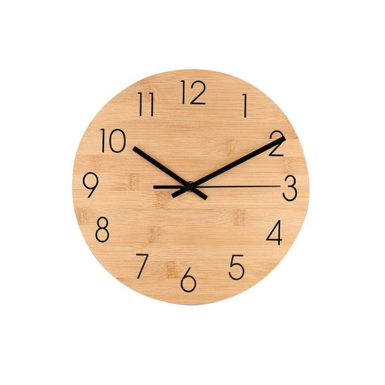 Wall clock in natural bamboo, with numbers and black metal dial. Battery operated (1xAA not included).Materials like bamboo promote the use of natural raw materials, reducing polluting emissions. Additionally, bamboo comes from a very resilient and versatile plant, with rapid growth and regeneration, making it an excellent alternative to traditional wood use. (neutral color)