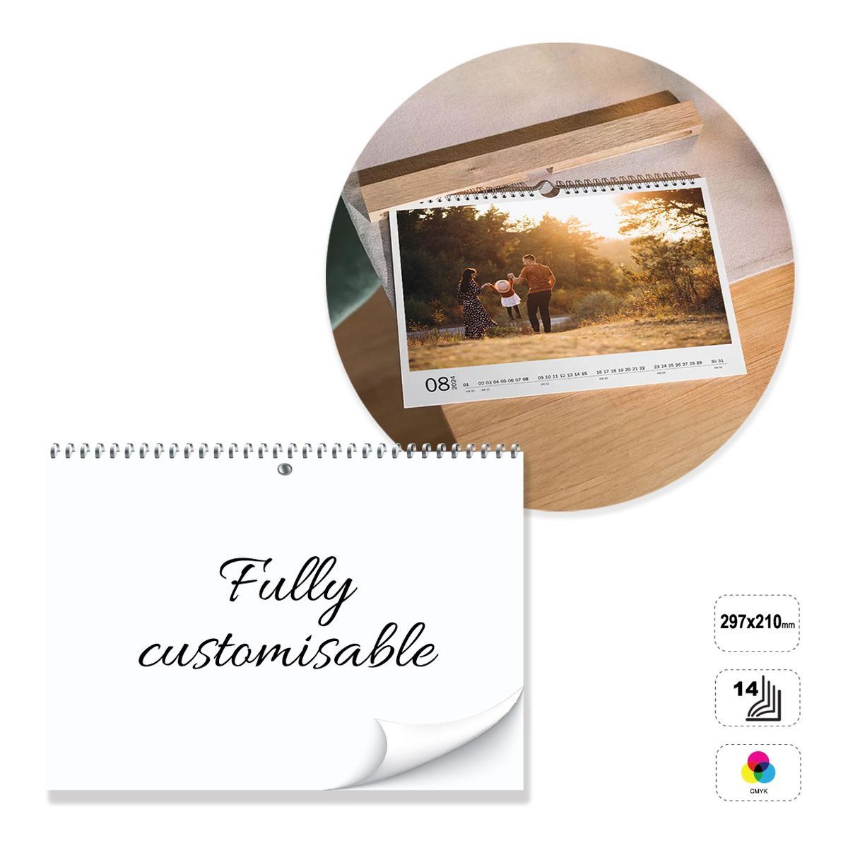 Horizontal wall calendar, fully customisable. The product consists of 14 sheets of 135 gram matt coated paper, printable front or front and back in full colour. Bound with a silver, white or black metal spiral at the top. Non-printable 300 g white cardboard backing. The calendar can be customised by modifying the preset template, or completely constructed following the guidelines provided in a neutral template.