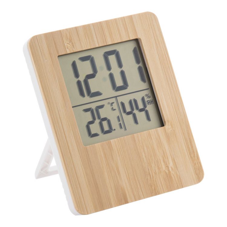 Weather station and digital clock with bamboo front panel. Functions: alarm clock, calendar, thermometer and humidity display. Operates with 2 AAA batteries, without battery