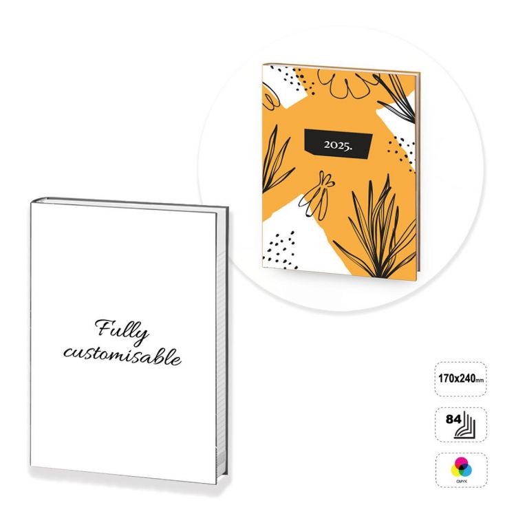 Fully customisable weekly diary. The product is made up of 84 pages (including cover) of 90-gram paper, printable in 1 colour (black), and the cover of 300-gram cardboard with a glossy glossy finish printable front or front and back in full colour. Laminating on the front is available with a choice of gloss, matt or soft touch. The product is made with a milled paperback, a special process that consists of ‘milling’ the pages glued together on the spine, to allow the glue that holds them together to penetrate more and make the product more resistant. The diary can be customised by modifying the preset template, or constructed completely following the guidelines provided in a neutral template.