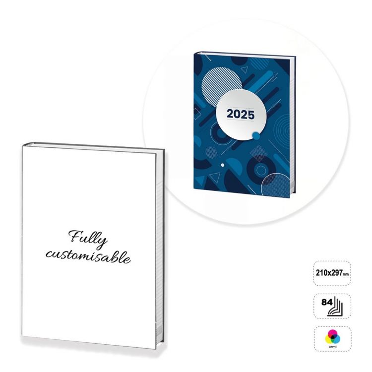 Fully customisable weekly diary. The product is made up of 84 pages (including cover) of 90-gram paper, printable in 1 colour (black), and the cover of 300-gram cardboard with a glossy glossy finish printable front or front and back in full colour. Laminating on the front is available with a choice of gloss, matt or soft touch. The product is made with a milled paperback, a special process that consists of ‘milling’ the pages glued together on the spine, to allow the glue that holds them together to penetrate more and make the product more resistant. The diary can be customised by modifying the preset template, or constructed completely following the guidelines provided in a neutral template.
