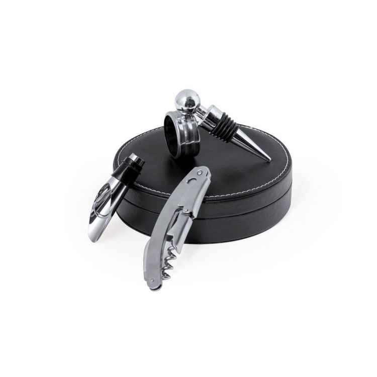 Wine set with elegant round design finished in PU leather, with stainless steel accessories. Including a 2 lever corkscrew with capsule cutter, a stopper, a doser and a drip stopper. (black color)