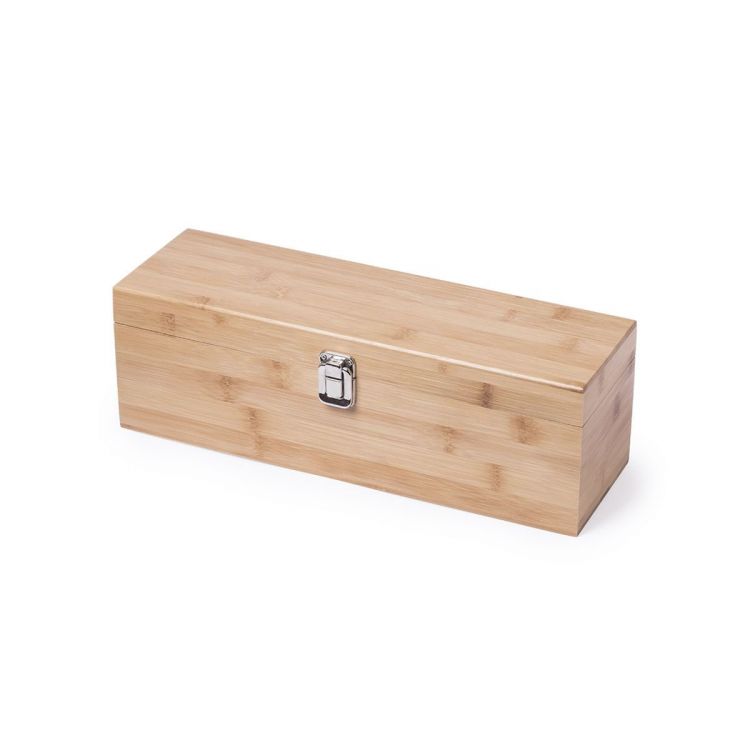 Premium wine set in bamboo wood. Stainless steel accessories. Includes corkscrew, capsule cutter, stopper, dispenser and drip collector. Presented in an individual, bamboo wooden case with compartment for wine bottle -not included-. (neutral color)