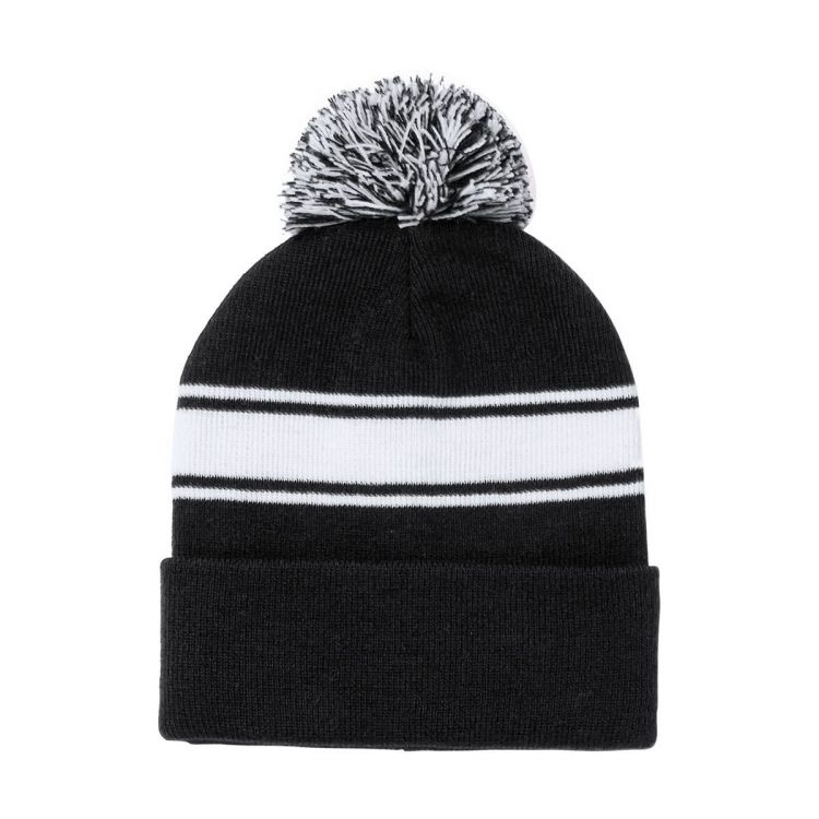 Acrylic winter hat with white stripes and matching colour pompom.