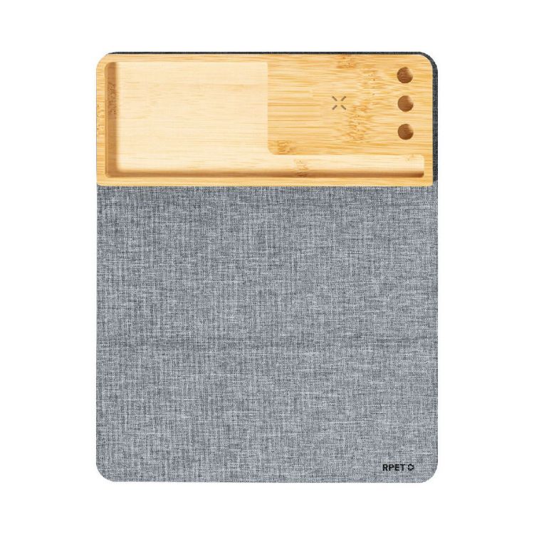 Foldable RPET polyester mousepad with silicone base. With built-in wireless fast charger (15W) and bamboo mobile phone holder. 300D RPET polyester. Including USB charger cable, in dark grey color