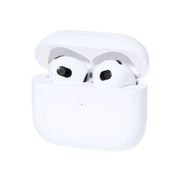 True wireless stereo (TWS) earphones with hands-free call function in plastic charger case. Including USB charger cable, in white color