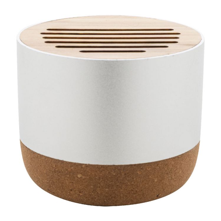 Wireless speaker in recycled aluminium housing with bamboo mesh and natural cork base. With rechargeable battery (400 mAh). Including USB charger cable.