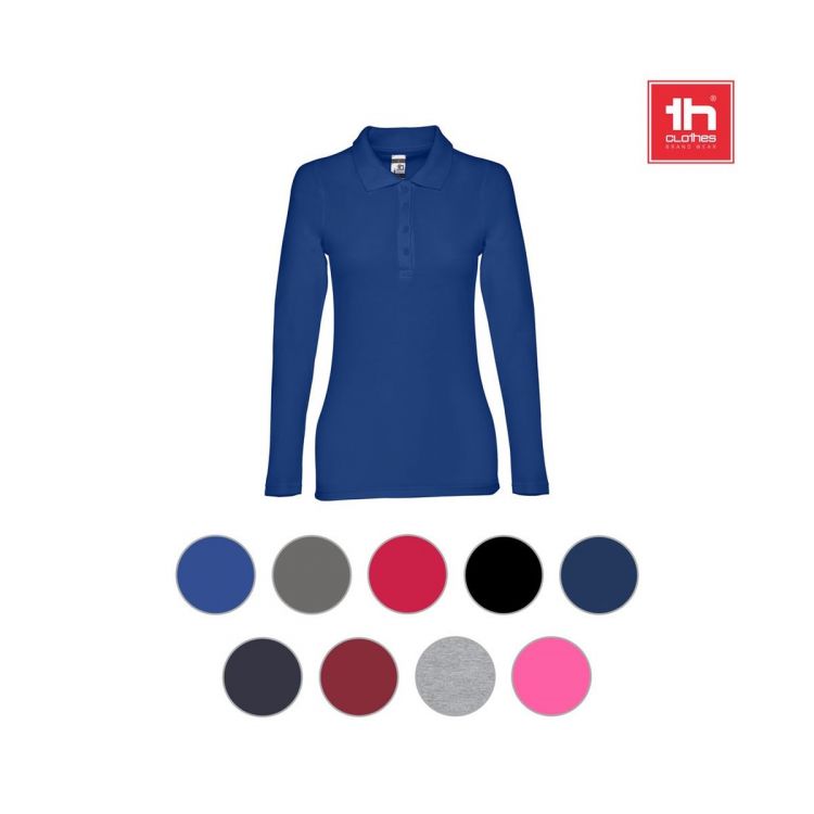 Long-sleeved polo for women in piqué 100% carded cotton (210 g/m²) (colour 183: 85% cotton/15% viscose). Rib collar reinforced with piqué knit ribbon. Features a reinforced placket with 4 matching colour buttons (extra button inserted in the inner seam). Piece cut and sewn with double seam sleeves. The visible label is removable