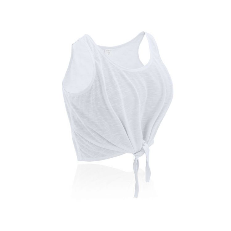T-shirt for girl in soft polyester 130g/m2. With tie rod design and with knot front closure. Available in white and a wide range of bright fluorescent colors. Sizes S, M, L.