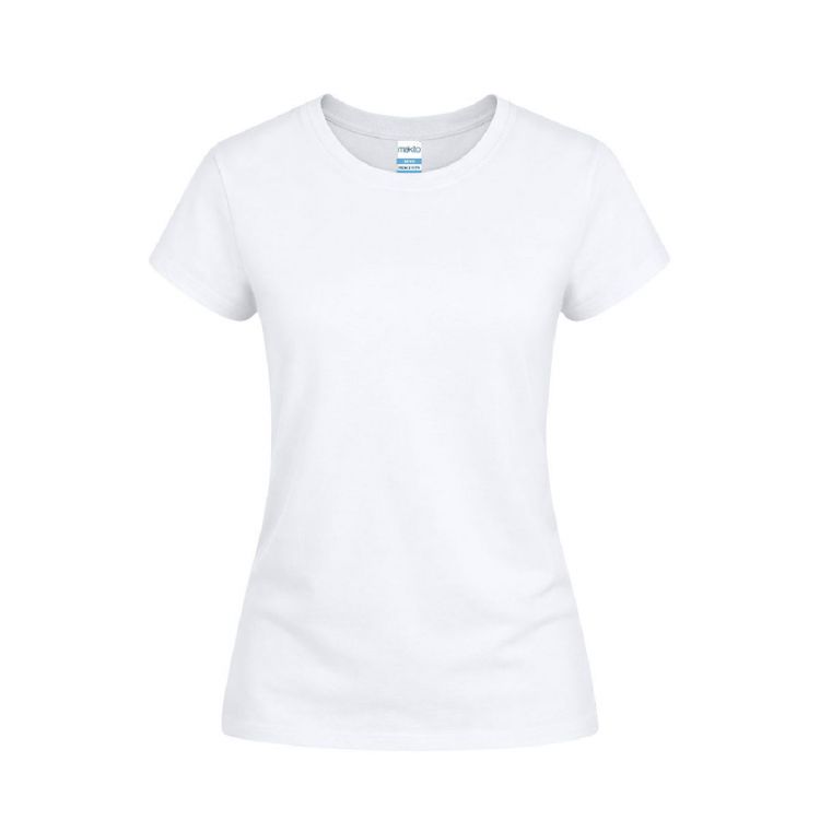 Women's T-shirt made from smooth knit fabric with soft 100% cotton, 160g/m². Tubular design without side seams and round neck. Available in white and in sizes S, M, L, XL, XXL.