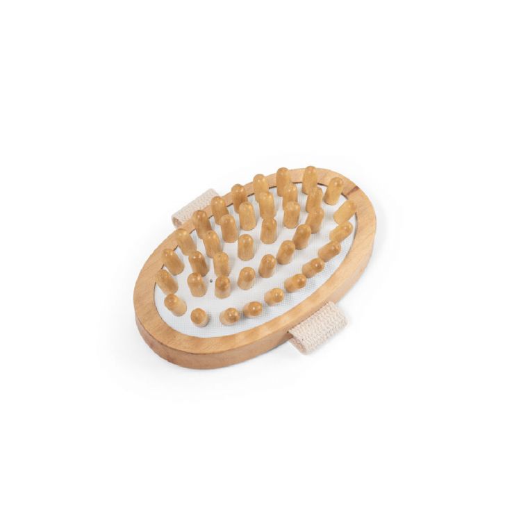 Wooden anti-cellulite bath massage brush (250 g/m²). With a cotton handle to help when massaging the body. Supplied in a kraft box. As the product is made from natural materials, the colour and the printing result may vary between products. Product in neutral color