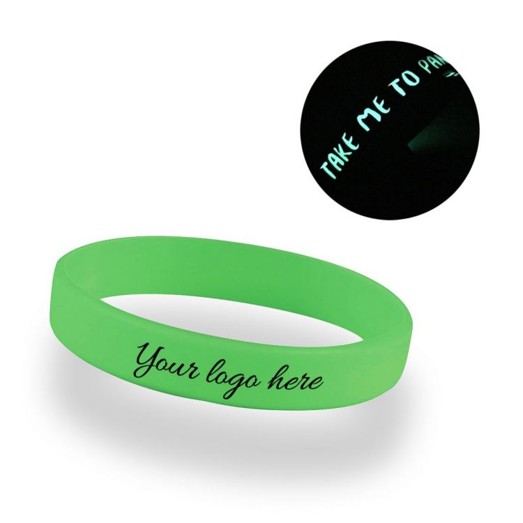 Custom silicone wristbands with glow-in-the-dark logo. The bracelet can be customized with a logo engraved in low relief without color or with a colored logo in 1 color only.