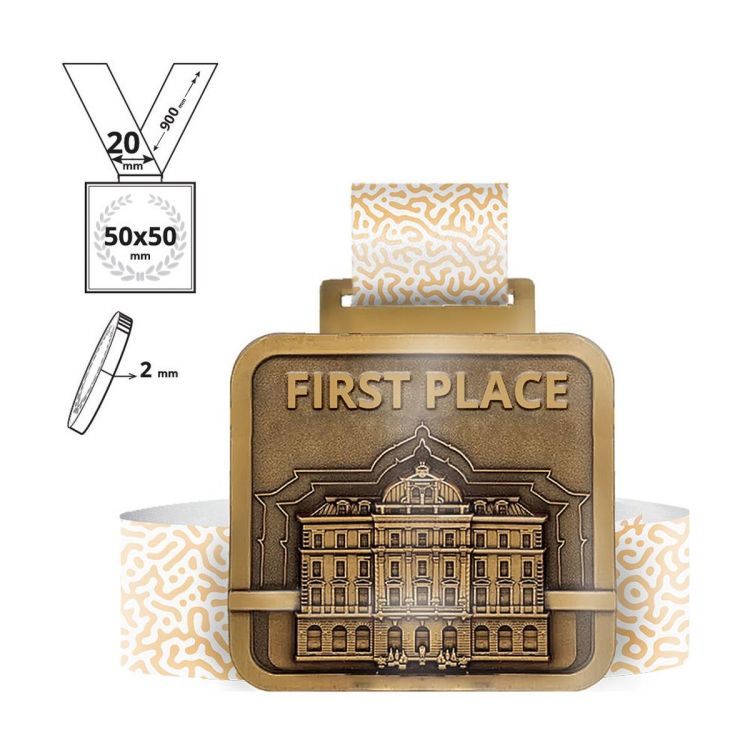 Square medal with a fully customisable 20x900 mm lanyard included. The medal is manufactured with a 3D effect mould specially created to the customer's design. Thanks to this processing we can obtain a unique, three-dimensional product, cast within the mould. The medals are available in three basic finishes (gold, silver and bronze) at the same price.