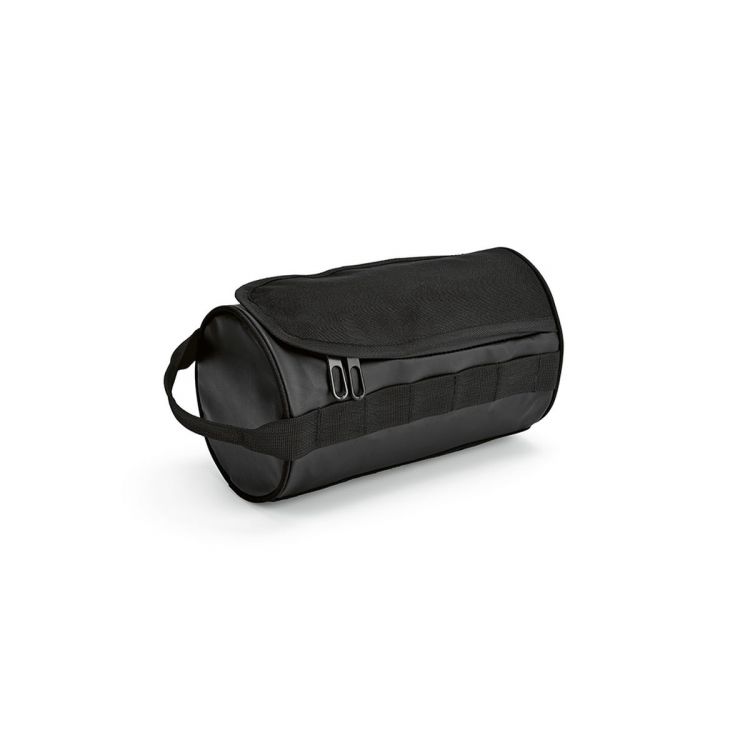 Riga barrel shaped toiletry bag (5.7L) in recycled polyester 600D. The water resistant fabric protects the contents and the double sided zipper provides easy access through the U shaped pocket. Comes with hanging loop for added convenience and with a carry handle.